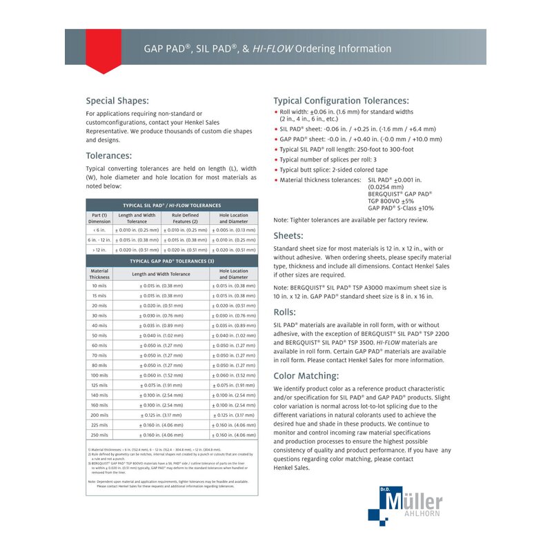 - Materialdickentoleranzen: SIL PAD® ±0,001 in. (0,0254 mm) BERGQUIST® GAP PAD® TGP 800VO ±5% GAP PAD® S-Class ±10%
