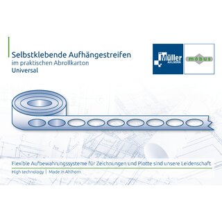 Selbstklebende Aufhängestreifen im praktischen Abrollkarton