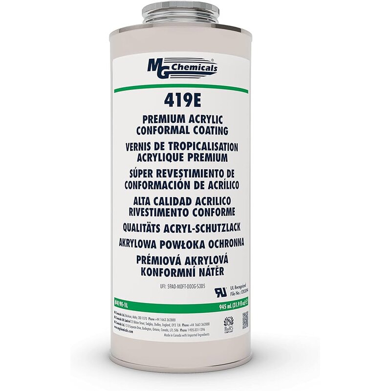 Premium Acrylic Conformal Coating 419E is a 1-part, UL 746E certified, acrylic conformal coating. It cures to a durable, flexible and smooth finish. It is easy to apply and can be handled in 15 minutes. It may be removed with appropriate strippers, or soldered through for repair or rework. 419E creates a robust moisture barrier that protects printed circuit boards in humid environments. It provides strong protection against moisture, corrosion, fungus, dirt, dust, thermal shock, short circuits, high-voltage arcing, and static discharge.