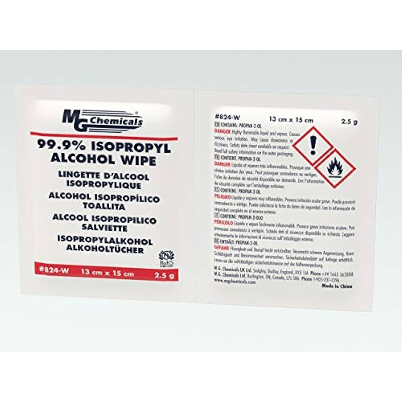 The 824-W Isopropyl Alcohol Wipe is a high purity cleaner. The wipe is good at dissolving dirt, light organic contaminants, and ionic flux residues. Since the 824-W is highly anhydrous (without water) and hygroscopic (absorbs humidity), it readily scavenges water off surfaces and helps to dehumidify surfaces.