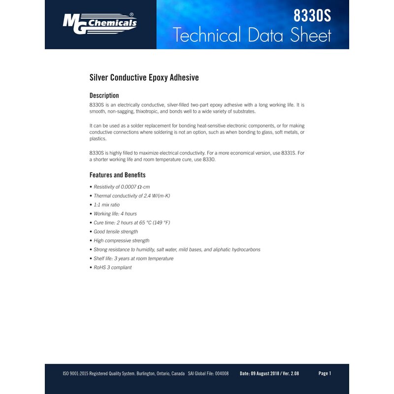 It can be used as a solder replacement for bonding heat-sensitive electronic components, or for making conductive connections where soldering is not an option, such as when bonding to glass, soft metals, or plastics. 8330S is highly filled to maximize electrical conductivity. For a more economical version, use 8331S. For a shorter working life and room temperature cure, use 8330.