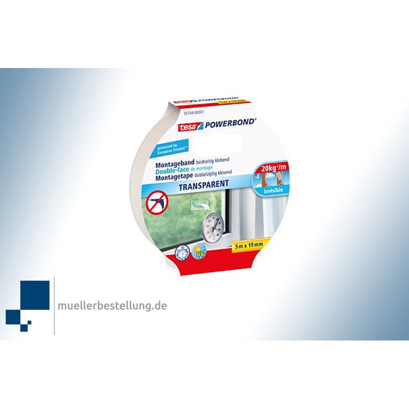 SPTESAPBTP-19-5 TESA Powerbond® 55744 Montageband transparent, 19 mm, 5 m Für die unsichtbare Befestigung, z.B. von transparenten Gegenständen oder bei der Anbringung auf Glasscheiben bietet das tesa® Powerbond eine hervorragende Lösung.